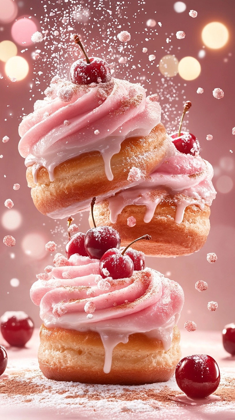 A hyper-realistic cinematic shot of four cinnamon rolls with cherries, floating gracefully in mid-air against a warm pastel brown background...